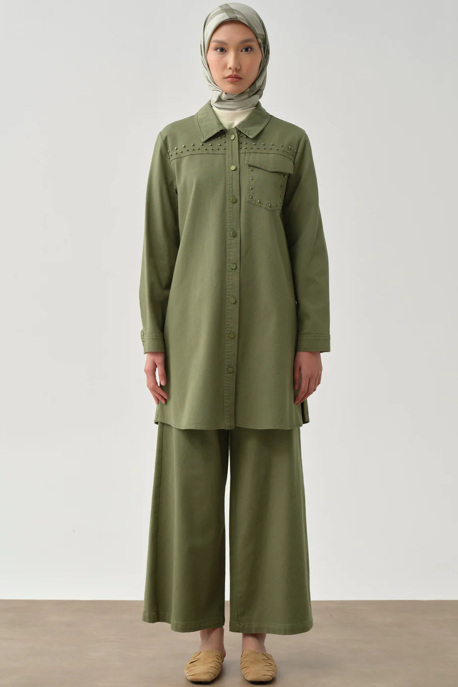 tunique à col caché et patte de boutonnage